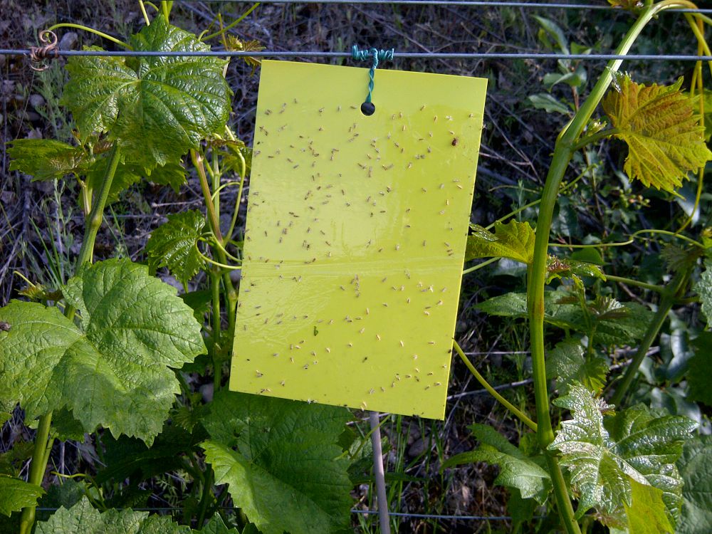Yellow sticky traps ย allow us to follow the kind and number of insect populations living in the vineyard.